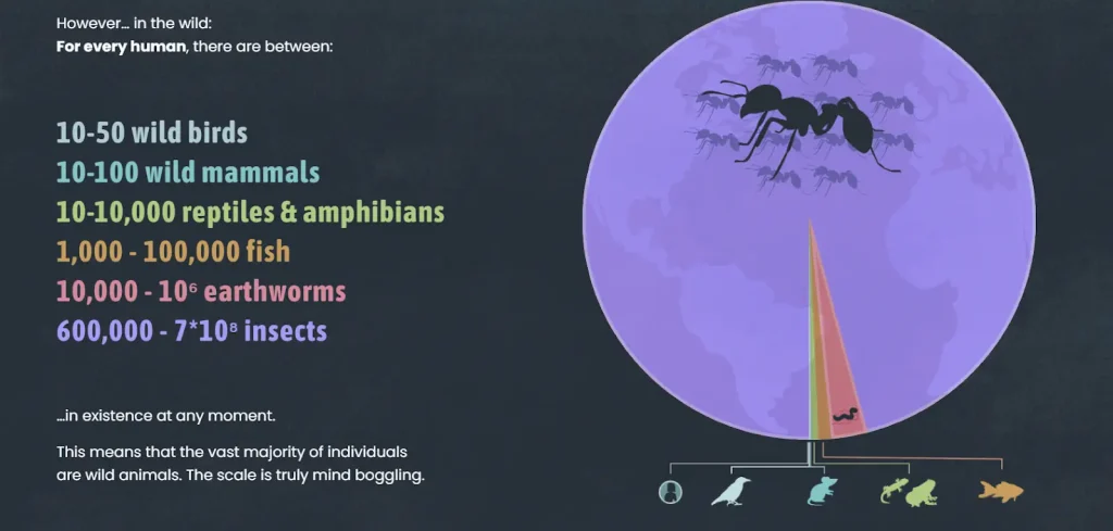 Hầu hết các cá thể động vật là động vật hoang dã. Tuy nhiên, chúng ta cũng cần nhớ rằng phần lớn động vật hoang dã là động vật nhỏ: chim, gặm nhấm, bò sát, cá, giun và côn trùng. Động vật càng nhỏ, số lượng càng lớn.